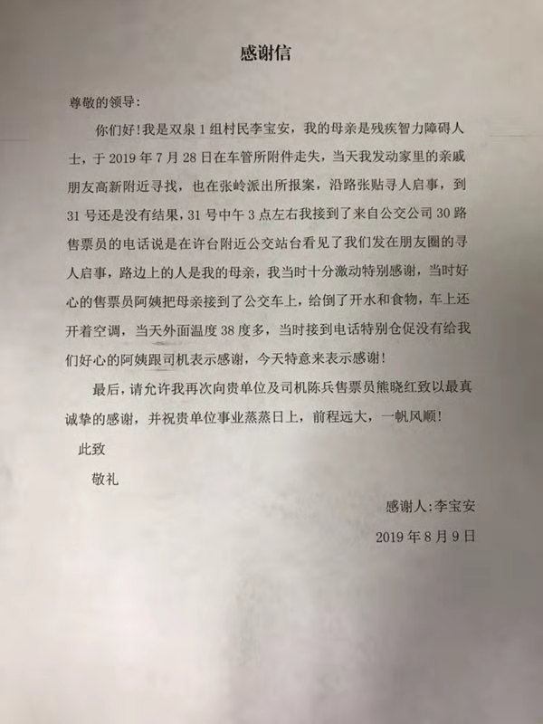 2019年8月9日,市公交公司辦公室收到了一面印有“熱心相助、弘揚美德”的錦旗和一封感謝信。